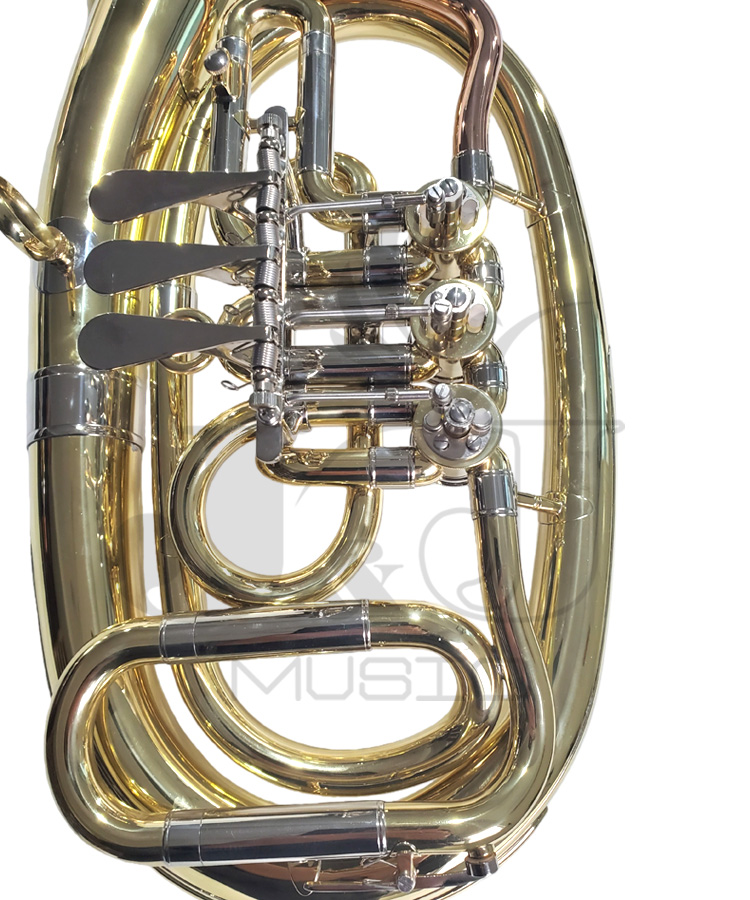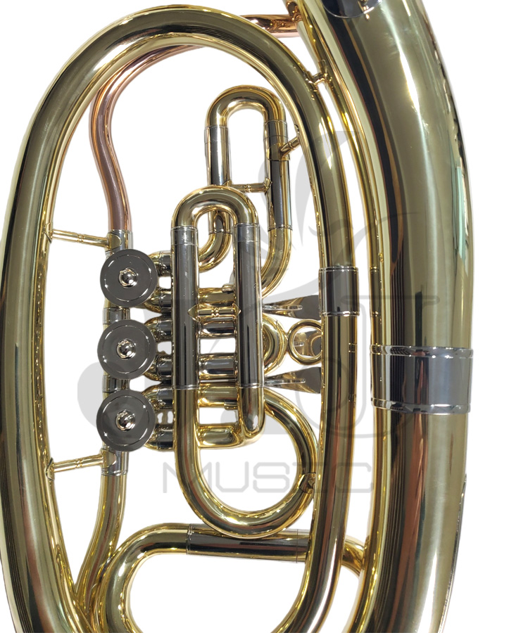 * Bb tone 3 rotary children baritone* Gold lacquer finish* Yellow brass bell* Bore size: 14mm* Bell size: 236.5mm* W/high-grade black canvas case