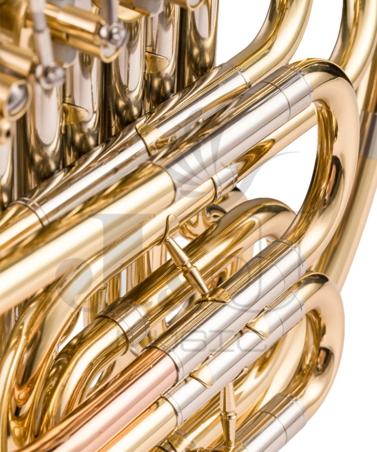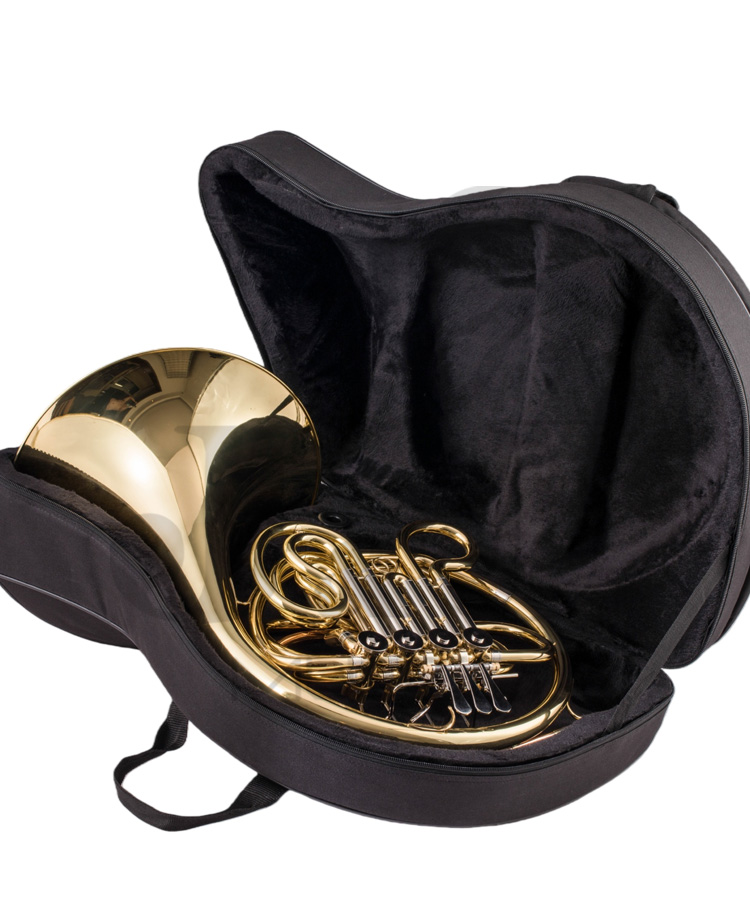 * F/Bb tone 4 keys French horn* Double line with no de-tachable bell* Gold lacquer finish* Bore size: 12mm* Bell size: 311mm* W/high-grade black series waterproof canvas case