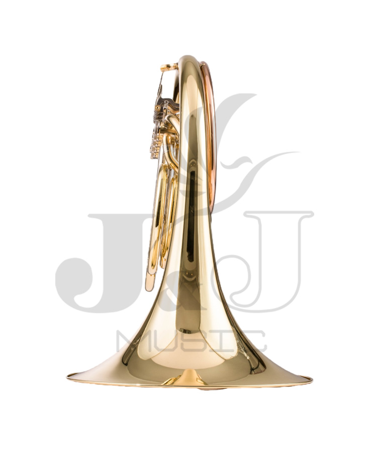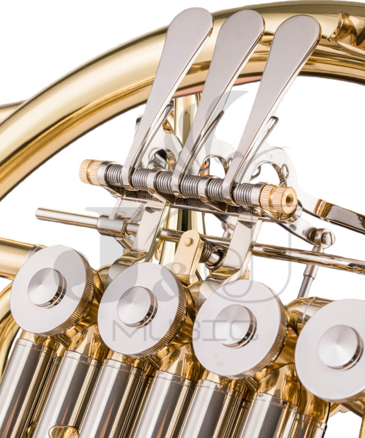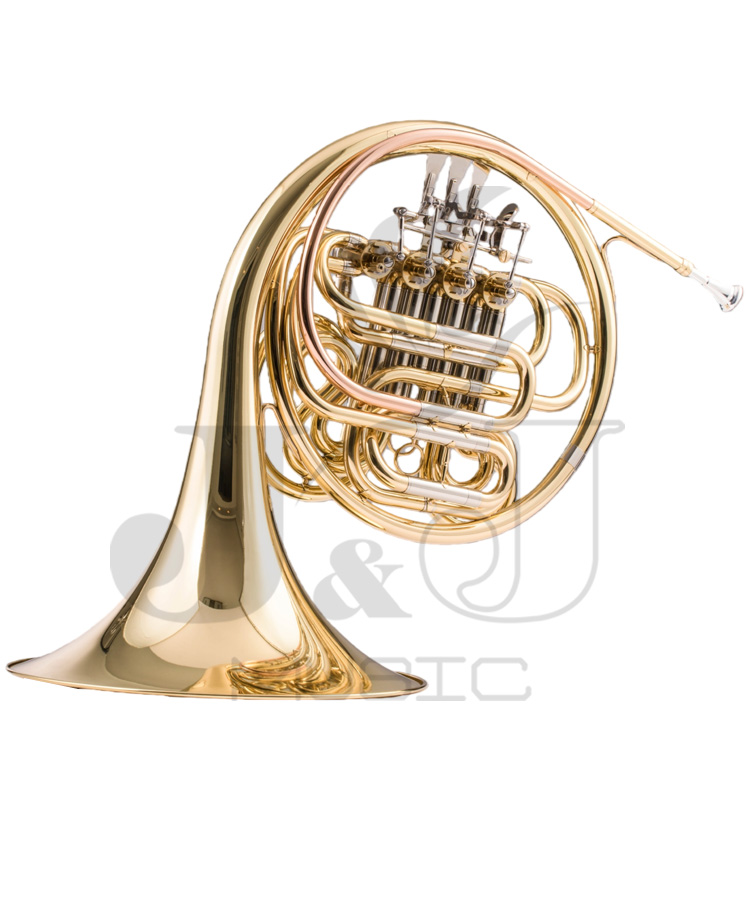* F/Bb tone 4 keys French horn* Double line with no de-tachable bell* Gold lacquer finish* Bore size: 12mm* Bell size: 311mm* W/high-grade black series waterproof canvas case