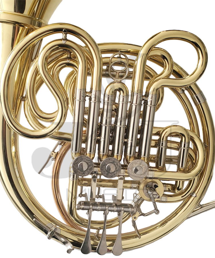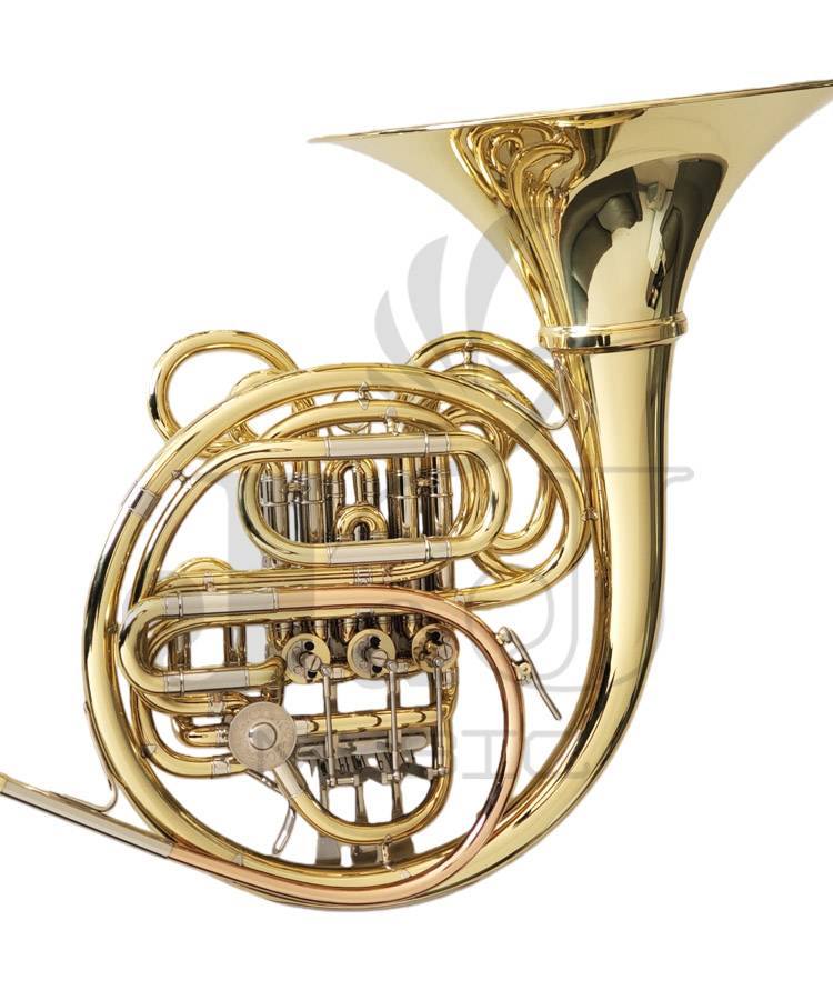 * Bb/F tone 4 keys professional French horn* Double line with no de-tachable bell* Gold lacquer finish* Bore size: 12mm* Bell size: 310mm* W/high-grade black series waterproof canvas case
